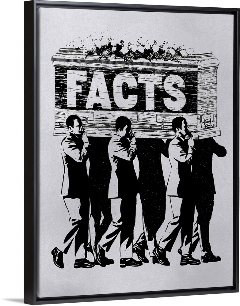 <p>Pall bearers carrying a casket with the word "FACTS" written on the side.</p>