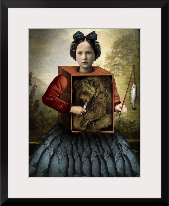 <p>A young girl with a bear inside of the box that is her torso, is wearing of shirt made of fish.</p>