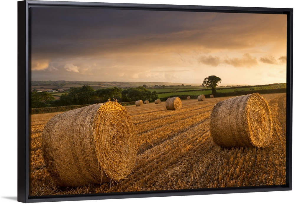 <p>Bales of hay in a field with a cloudy sky above.</p>