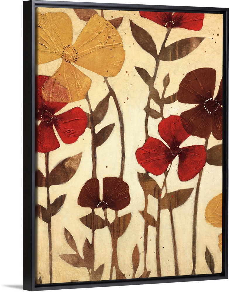 <p>Vertical painting of a group of flowers in muted earth tones with textured petals.</p>