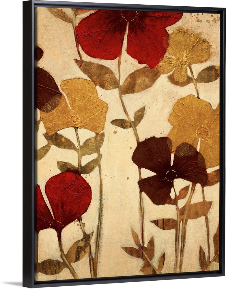 <p>Vertical painting of a group of flowers in muted earth tones with textured petals.</p>
