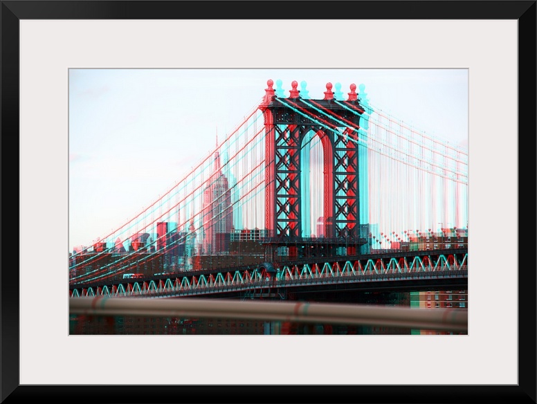 <p>Photograph of New York city architecture with multiple exposures resembling anaglyph 3D images.</p>