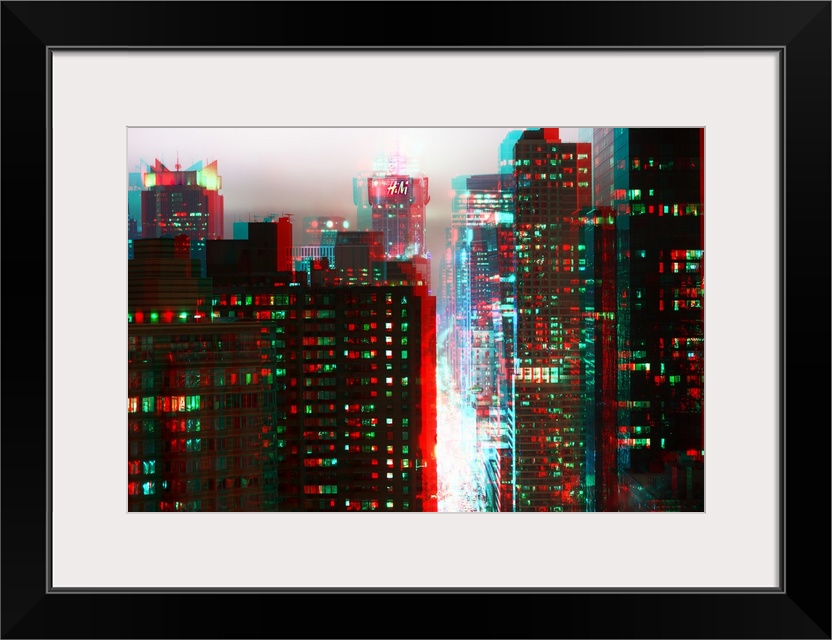 <p>Photograph of New York city architecture with multiple exposures resembling anaglyph 3D images.</p>