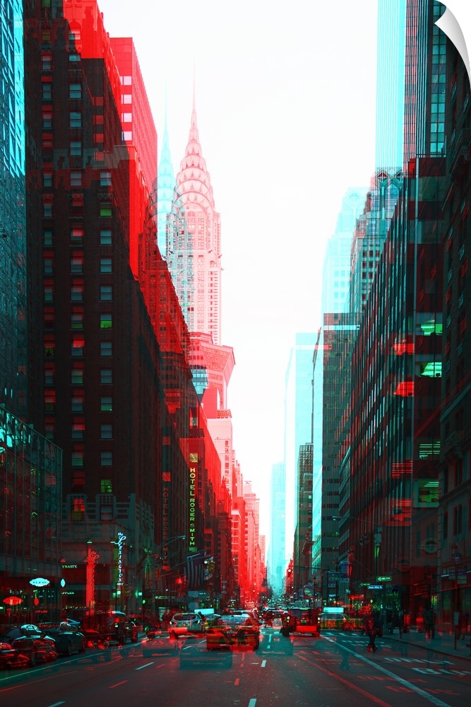<p>Photograph of New York city architecture with multiple exposures resembling anaglyph 3D images.</p>