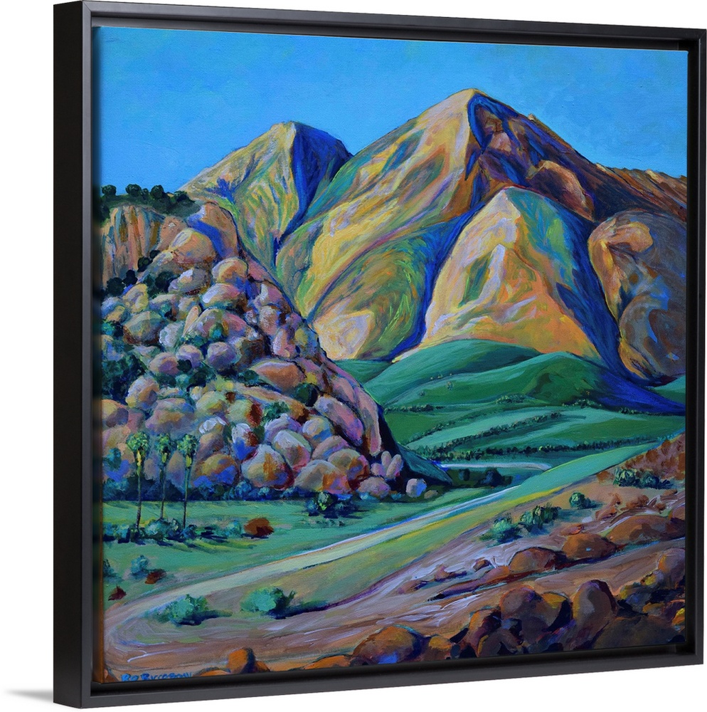 <p>Afternoon Delight by RD Riccoboni, San Diego California Mountains and valley. Boulders rocks cliffs and a winding road with green hills and golden mountains.</p>