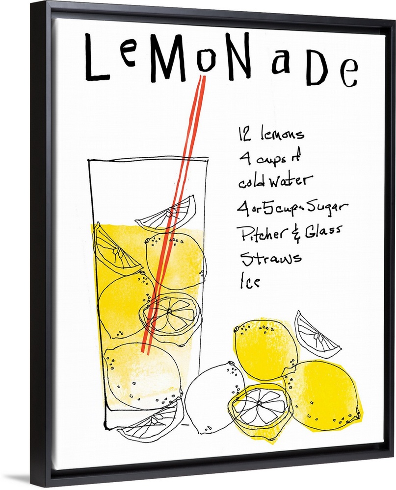 <p>This is a vertical illustration for the living room or kitchen of a hand drawn glass of lemonade and lemons with instructions on how to make the beverage.</p>