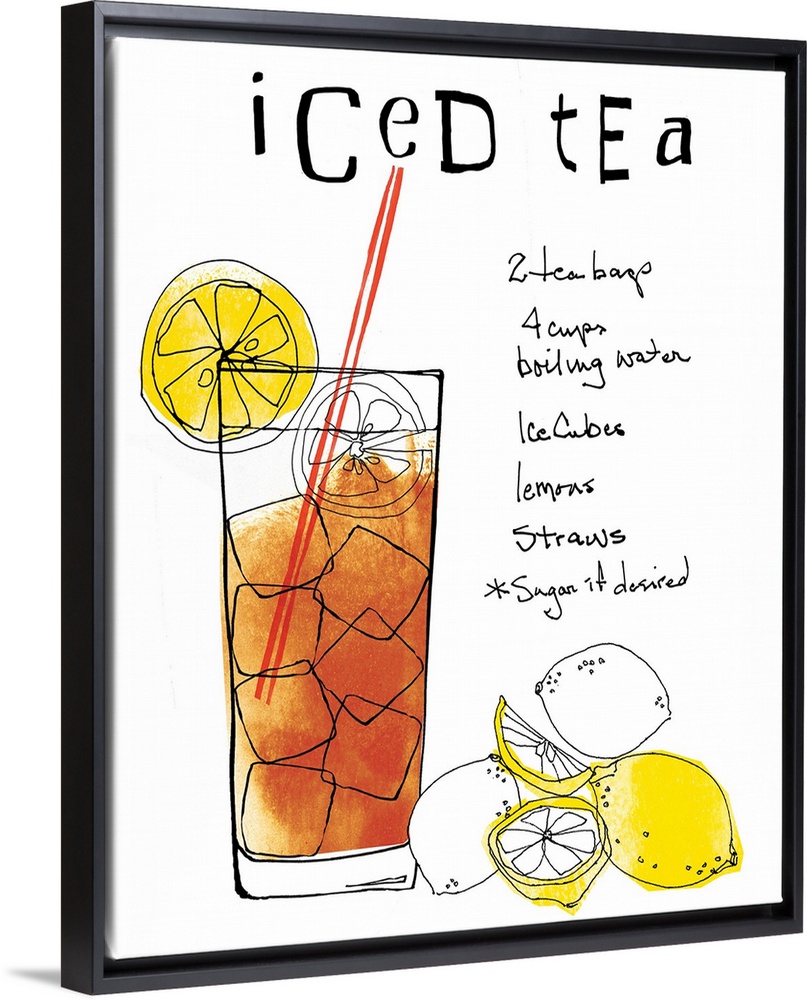<p>This vertical decorative art for a kitchen or cafo gives hand written instructions for making ice tea (sugar if desired) and a line drawing of tall glass garnished with a lemon and straw.</p>