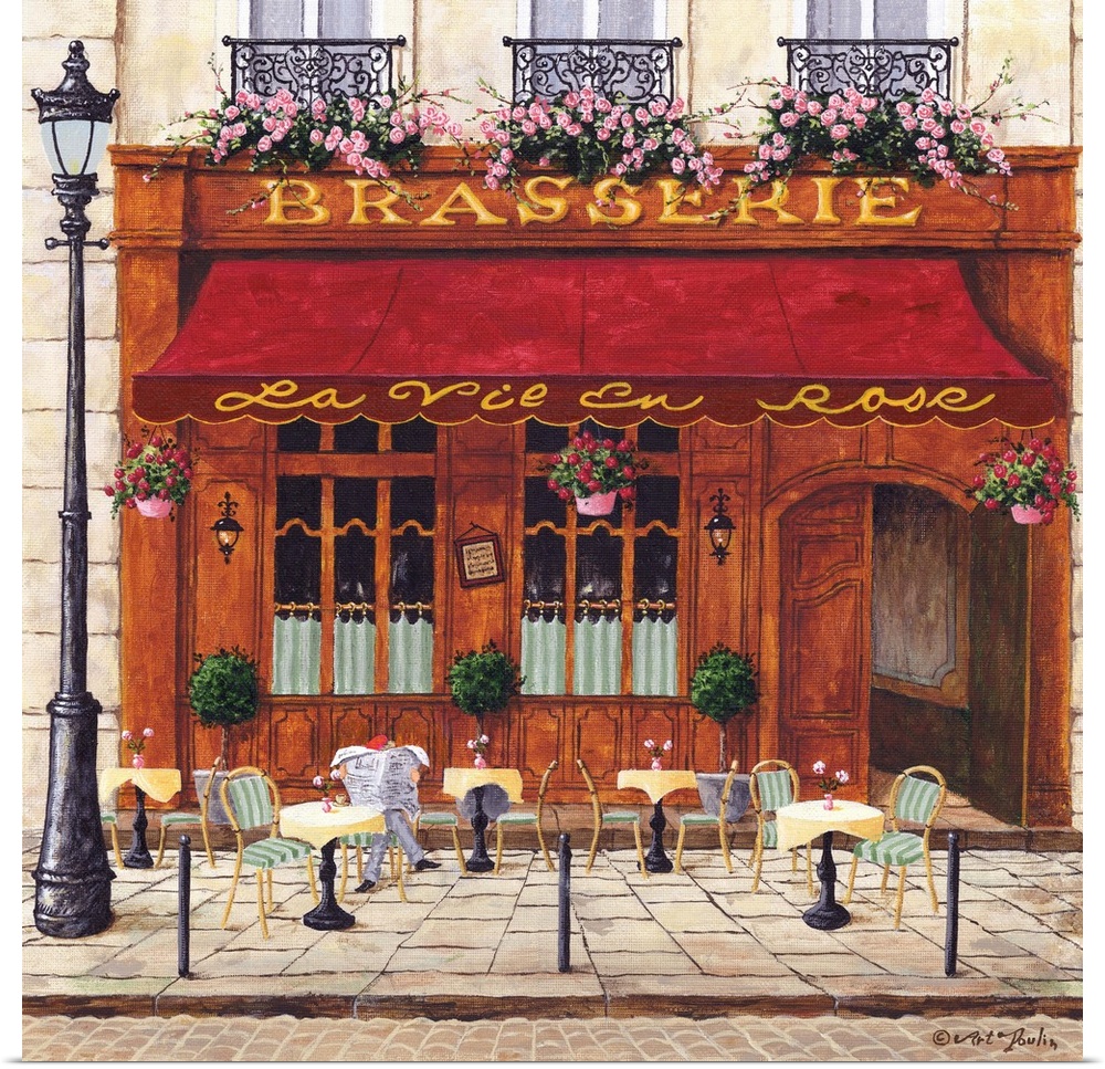 <p>Painting of a Parisian cafe with seating out front.</p>
