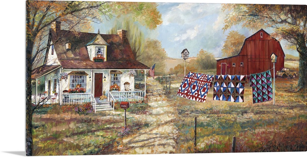 <p>Large contemporary painting of a farm house and a red barn with three quilts hanging on the line.</p>