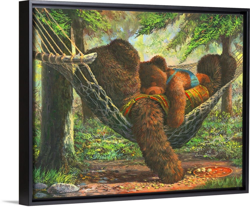 <p>Cute artwork of a dad teddy bear laying on a hammock with his son laying on his chest.</p>