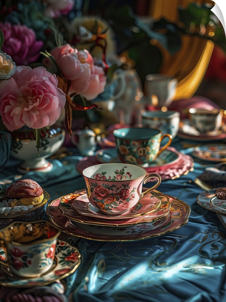<p>A table laid out for high tea in England with decorative bone china cups and saucers with flowers.</p>