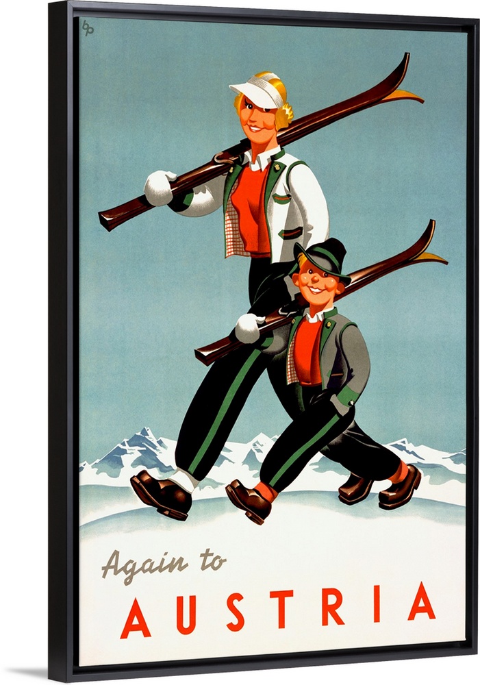 <p>This cheerful postwar Austrian travel poster radiates optimism and Alpine charm. A smiling mother and son, clad in traditional Tyrolean-inspired ski attire, stride confidently through snow-covered peaks. Designed to promote tourism revival, the phrase "Again to Austria" invites visitors to rediscover the country's natural beauty and hospitality. With its bold geometric styling and vivid color contrasts, the image reflects 1950s modernism while appealing to nostalgic memories of pre-war alpine holidays.</p>