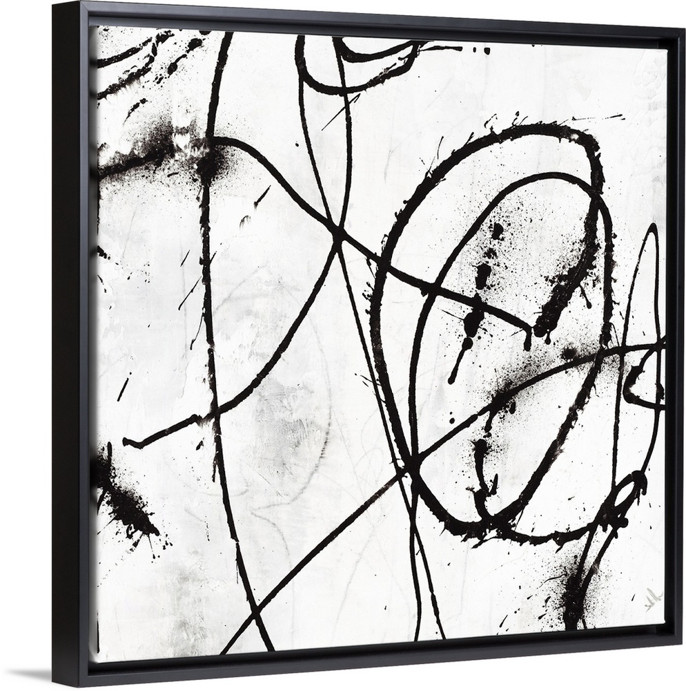 <p>Black and white abstract painting of black strokes of paint in wandering directions.</p>