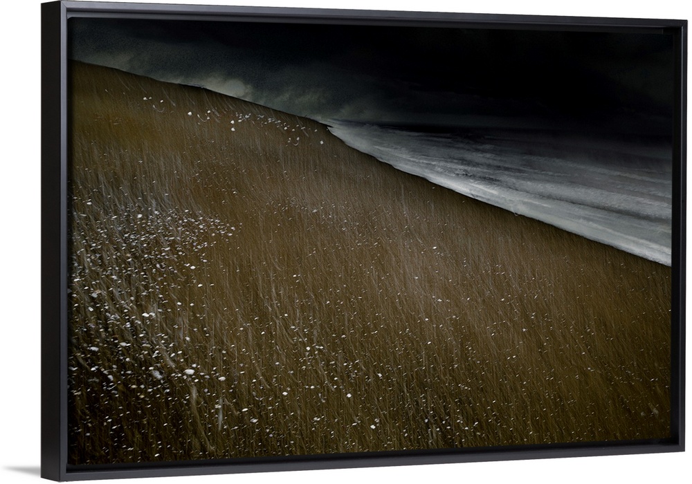 <p>Abstract photograph of a beach landscape with dark ocean waves crashing on a dark sandy beach with white specks and thin lines all over.</p>