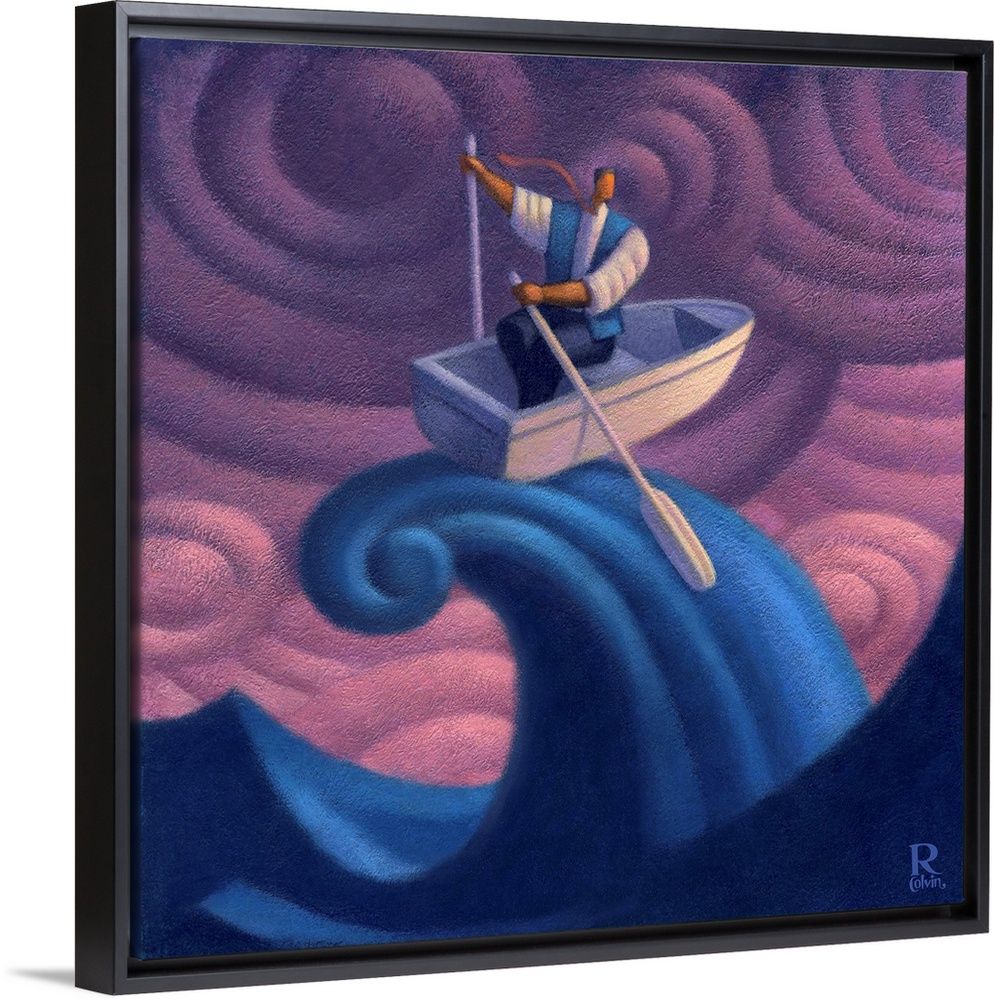 <p>Contemporary painting of a man struggling to row against the tide.</p>