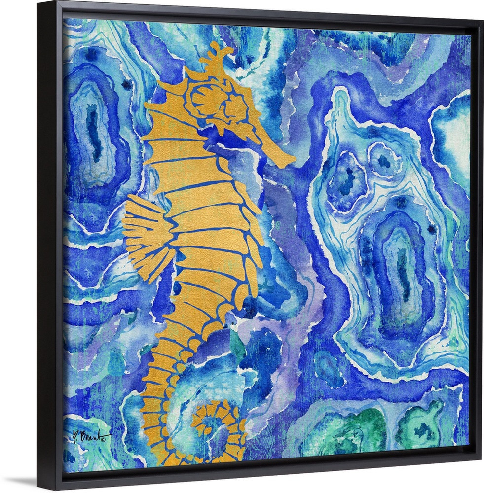 <p>Square decor with a metallic gold seahorse on a blue, green, and purple agate patterned background.</p>