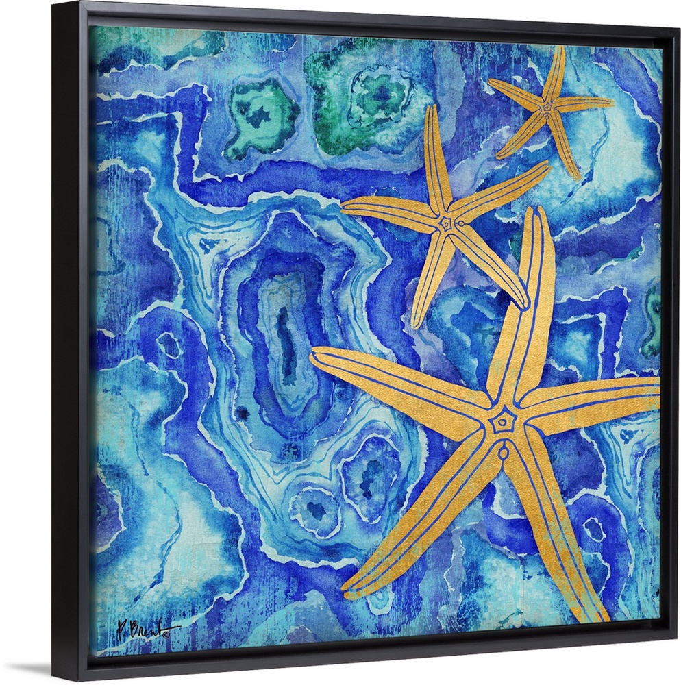 <p>Square decor with metallic gold starfish on a blue, green, and purple agate patterned background.</p>