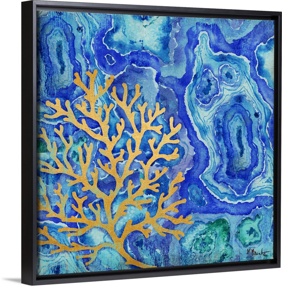 <p>Square decor with metallic gold coral on a blue, green, and purple agate patterned background.</p>