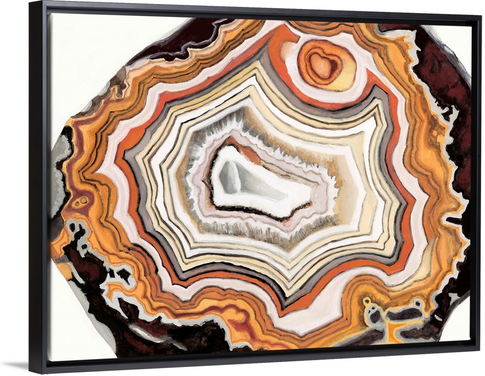 <p>Contemporary painting of a cross section of mineral agate in bright orange.</p>