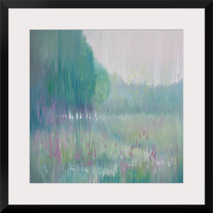 <p>Watercolor painting of a dream-like meadow in a forest in varies shades of green.</p>