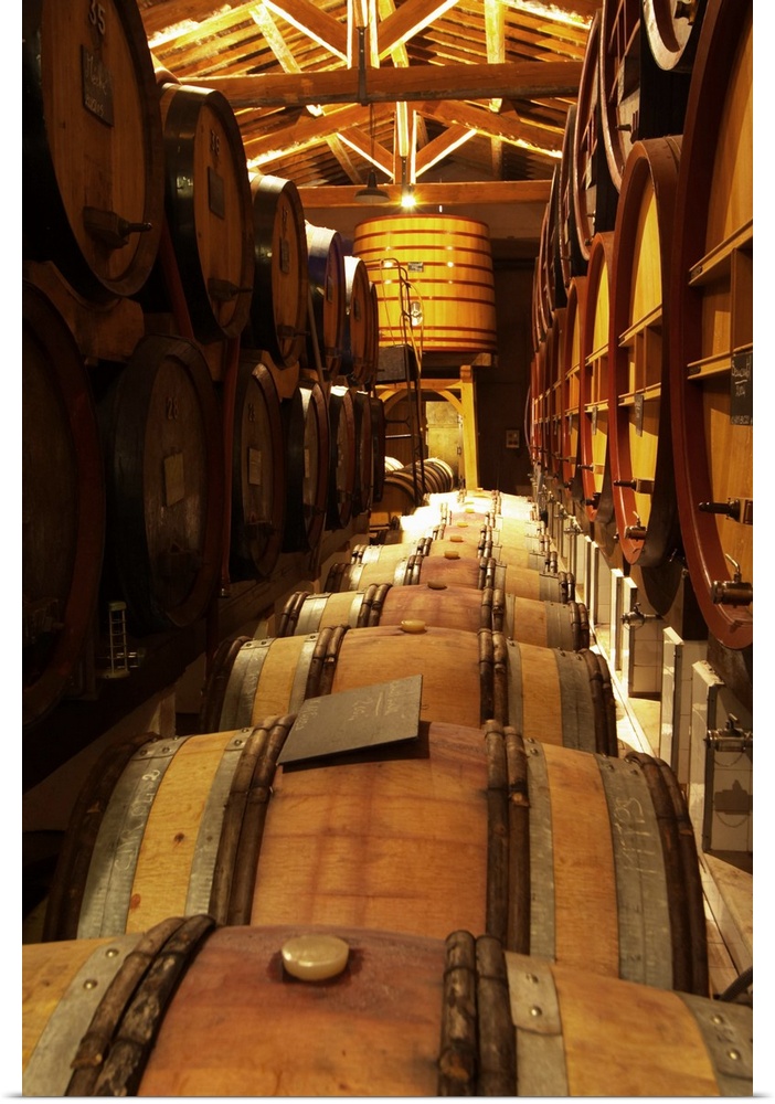 <p>The aging cellar with oak barrels and larger wooden vats. Chateau de Beaucastel, Domaines Perrin, Courth..zon Courthezon Vaucluse France Europe</p>