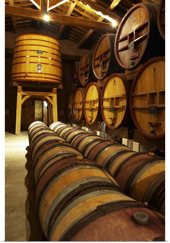<p>The aging cellar with oak barrels and larger wooden vats. Chateau de Beaucastel, Domaines Perrin, Courth..zon Courthezon Vaucluse France Europe</p>