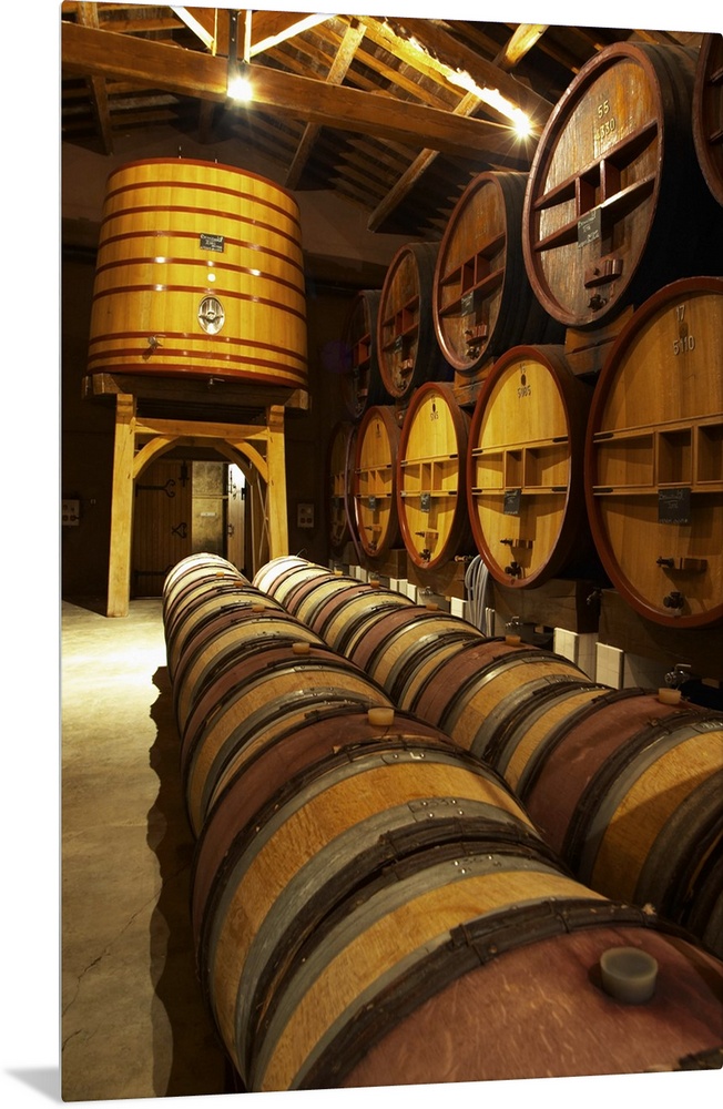 <p>The aging cellar with oak barrels and larger wooden vats. Chateau de Beaucastel, Domaines Perrin, Courth..zon Courthezon Vaucluse France Europe</p>