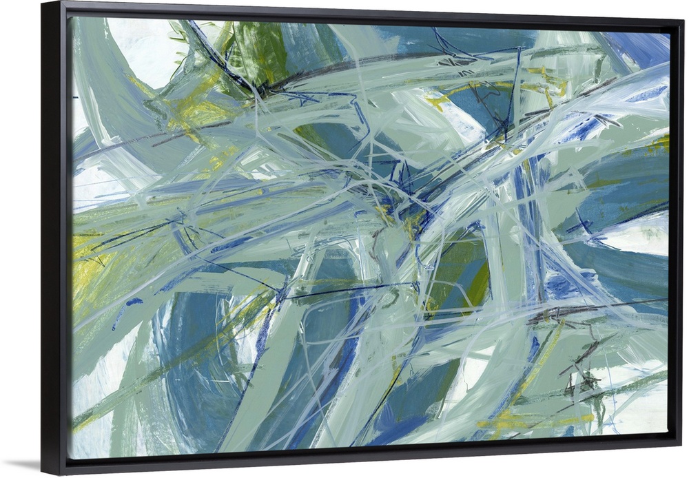 <p>A contemporary abstract painting using tones of green and blue in a fluid dynamic movements creating a web of color.</p>