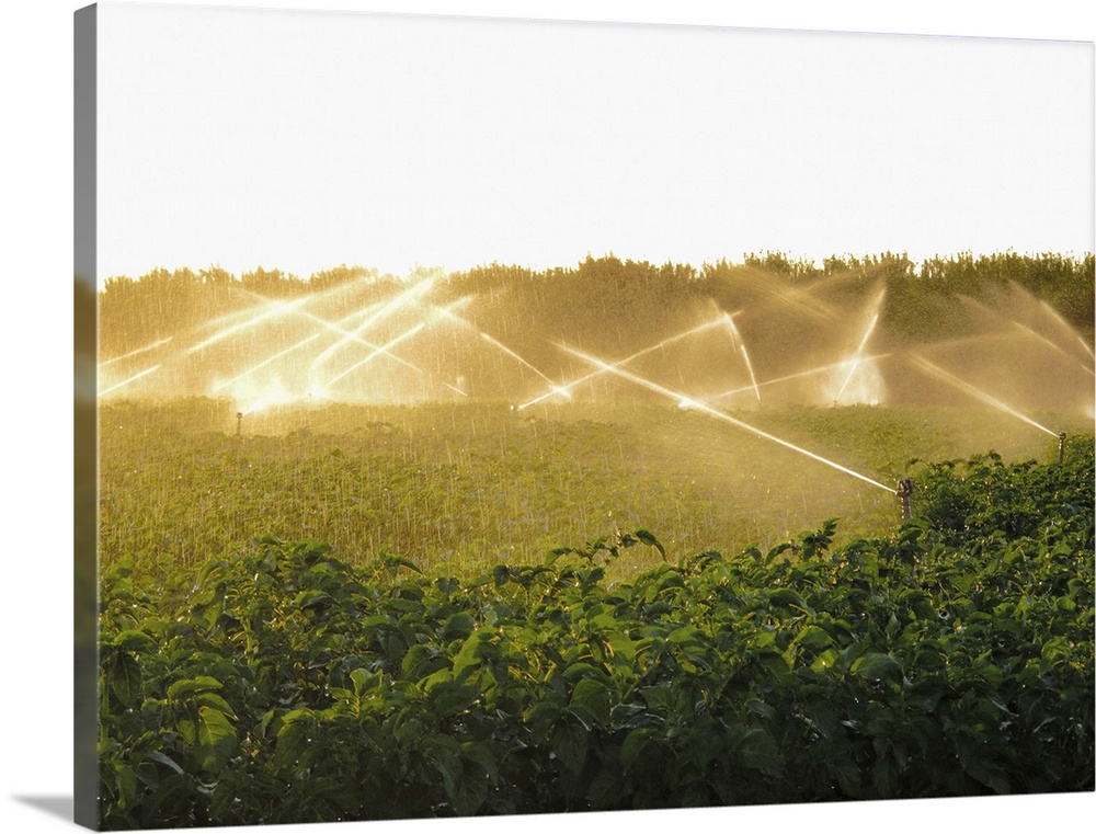 <p>Agricultural irrigation system watering vegetables at sunset in the Central Valley, California</p>