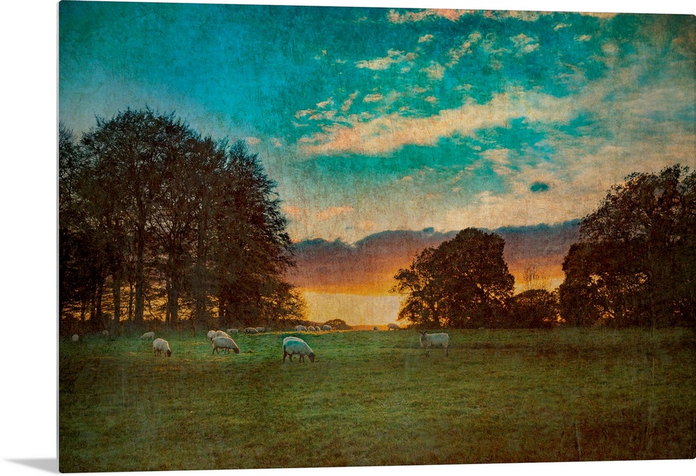 <p>Rural countride view across agricultural land at dusk in East Sussex, England with sheep grazing in a field at dusk.</p>