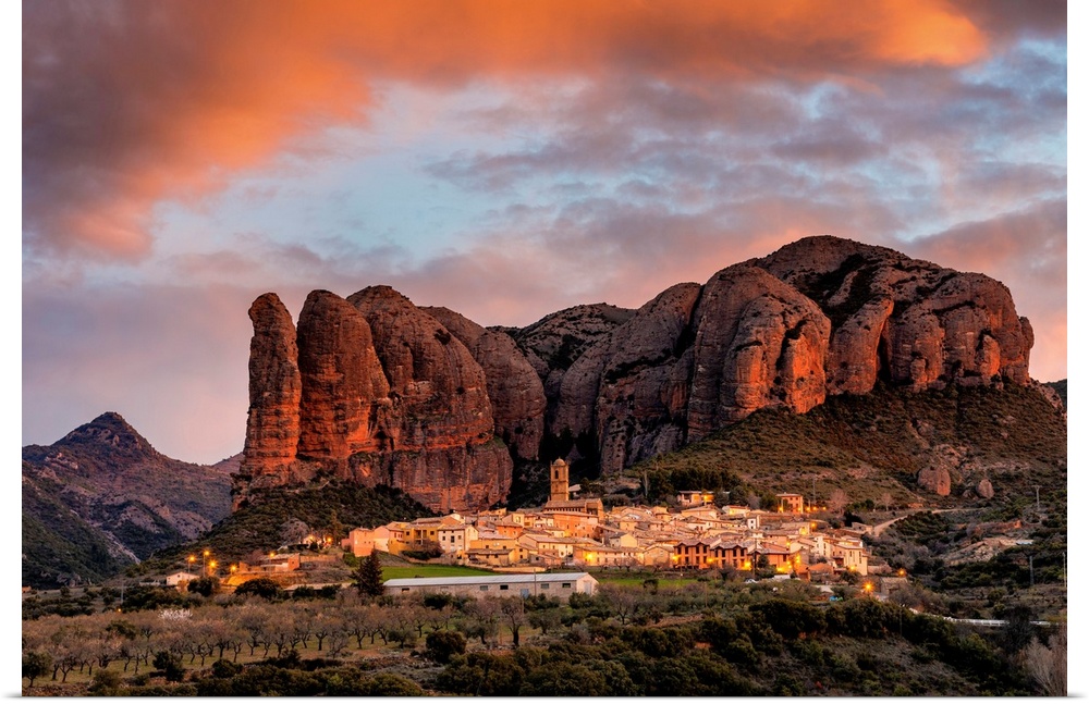 <p>Aguero Village With Mallets Of Aguero At Sunrise. Aguero, Province Of Huesca, Aragon, Spain</p>