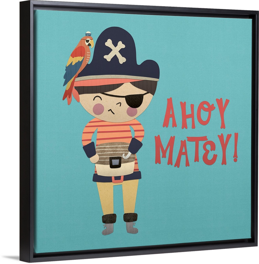 <p>A darling illustration of a young pirate with a parrot and "Ahoy Matey!" on a blue background.</p>