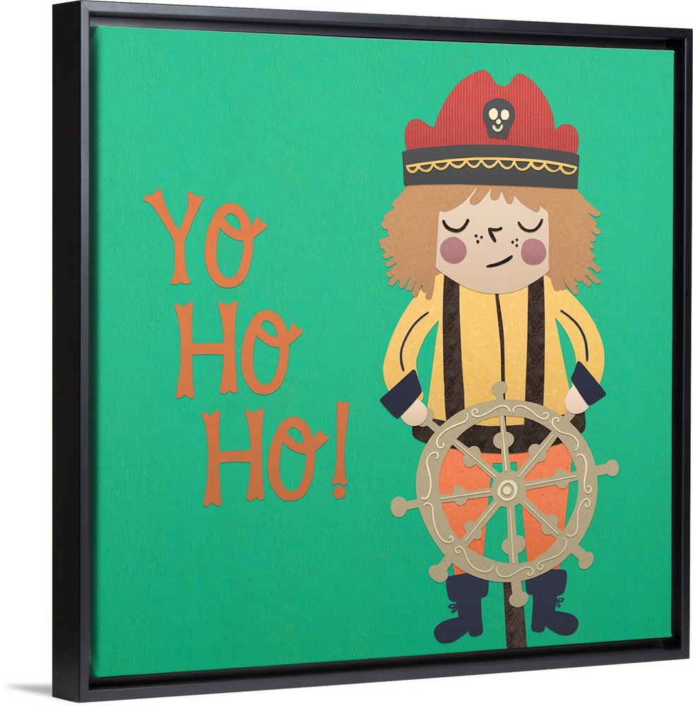<p>A darling illustration of a young pirate with a ship's steering wheel and "HO Ho Ho!" on a green background.</p>