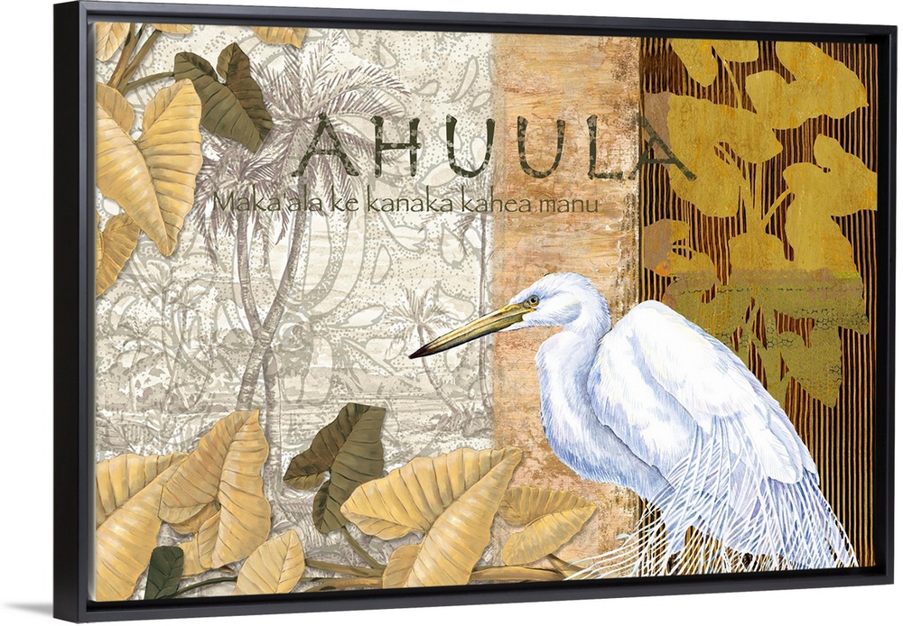 <p>Mixed media artwork featuring a great white egret, decorative frond silhouettes, and the word Ahuula, a traditional Hawaiian feather cloak.</p>