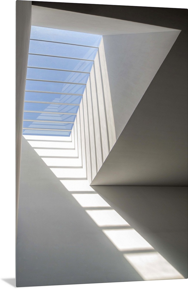 <p>Blue sky seen through a slotted window, casting an abstract shadow.</p>