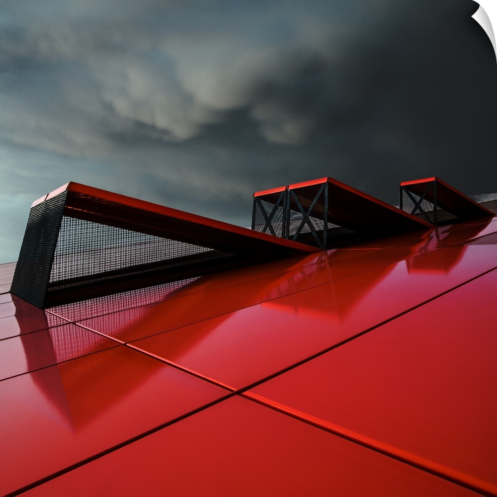 <p>Looking up at an abstract detail of architecture against a dark gray sky.</p>