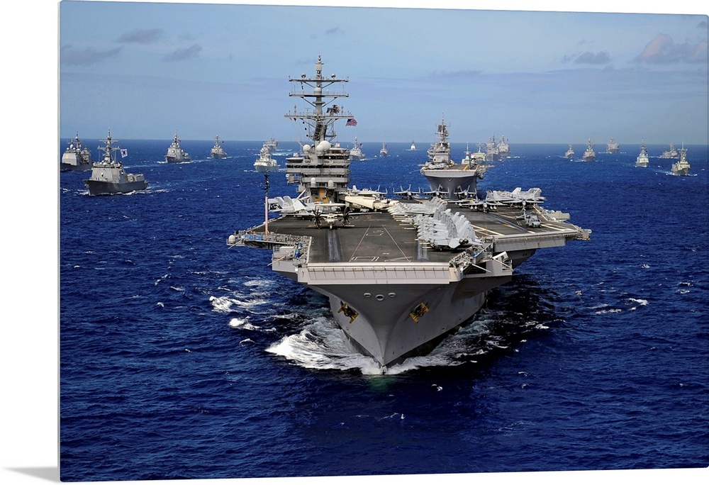 <p>The Nimitz-class aircraft carrier (CVN-76) leads a mass formation of ships from Korea, Taiwan, Japan, Singapore, France, Canada, Australia and the United States through the Pacific Ocean during Rim of the Pacific (RIMPAC) 2010. The RIMPAC is the world's largest international maritime exercise and is designed to increase mutual cooperation and enhance the tactical capabilities of participating nations in various aspects of maritime operations at sea.</p>