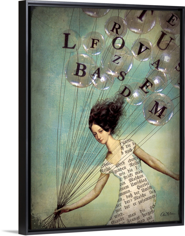 <p>A digital composite of a female holding a large amount of balloons with letters on them.</p>