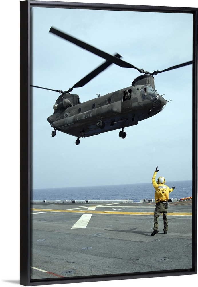 <p>Airman directs an Army CH-47 Chinook helicopter on the flight deck.</p>