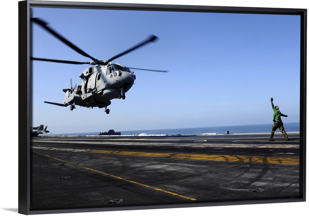 <p>Arabian Sea, October 24, 2011 - Airman directs an EH-101 Merlin helicopter onto the flight deck aboard the Nimitz-class aircraft carrier USS John C. Stennis. John C. Stennis is deployed to the U.S. 5th Fleet area of responsibility conducting maritime security operations and support missions as part of Operations Enduring Freedom and New Dawn.</p>