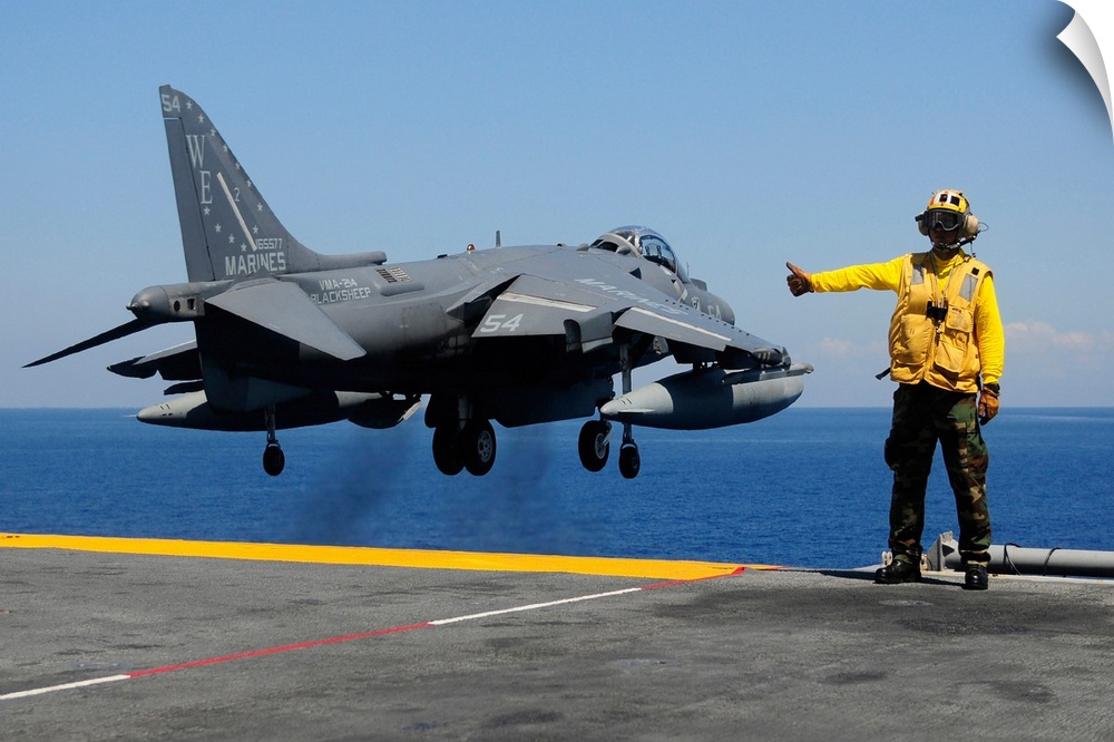 <p>Airman gives the thumbs-up signal as an AV-8B Harrier takes off from the flight deck of USS Essex.</p>