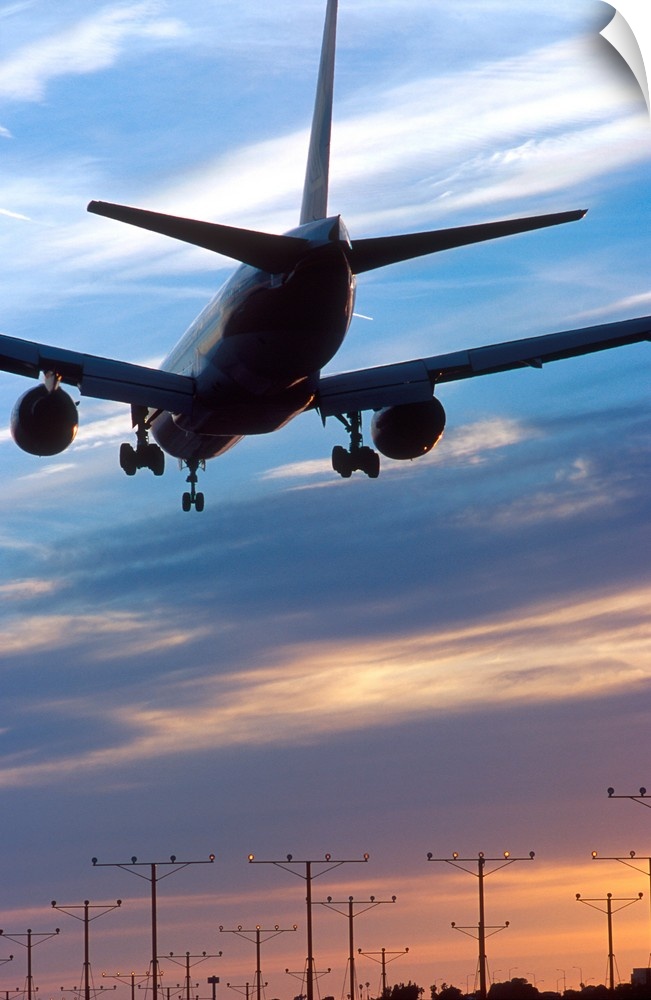 <p>Airplane landing at LAX airport in Los Angeles, California at sunset.</p>