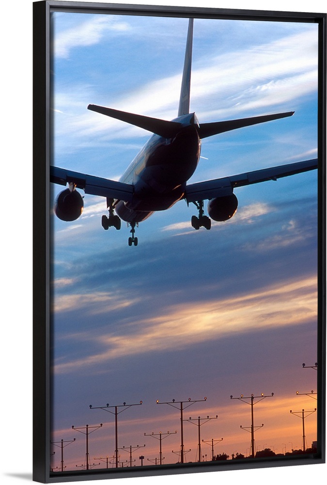 <p>Airplane landing at LAX airport in Los Angeles, California at sunset.</p>