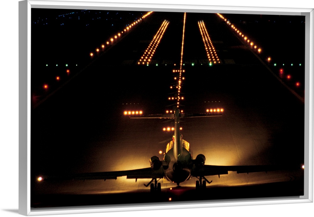 <p>Giant photograph shows a small aircraft stationed at the end of a brightly lit airstrip at nighttime.</p>