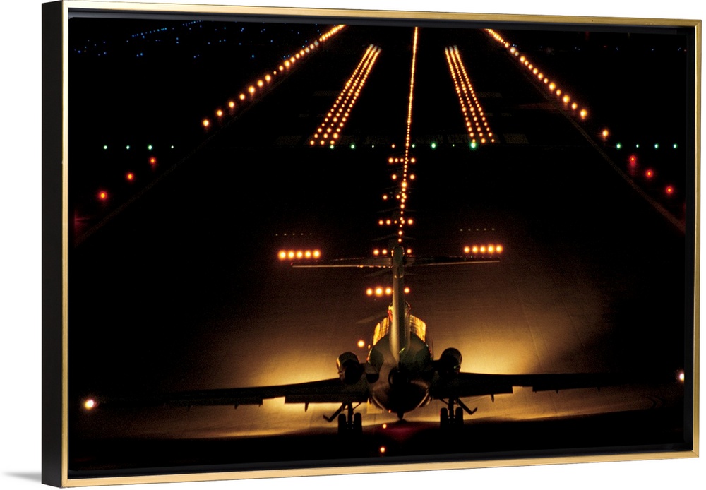 <p>Giant photograph shows a small aircraft stationed at the end of a brightly lit airstrip at nighttime.</p>