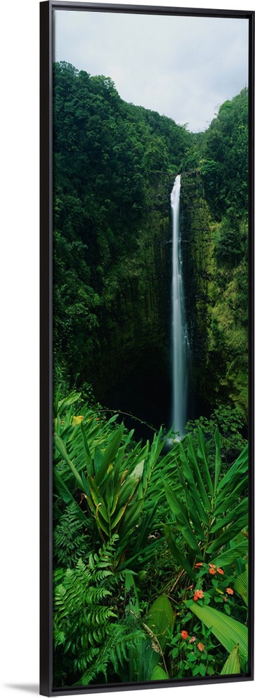 <p>A waterfall plunges into a steep gorge surrounded by tropical jungle in this Hawaiian state park in this vertical wall art.</p>