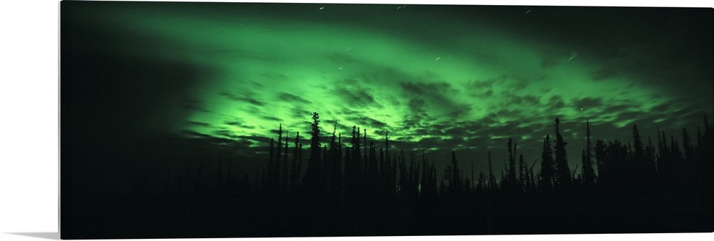 <p>Giant, panoramic photograph of the northern lights in Fairbanks, Alaska, over the silhouettes of trees in the foreground.</p>