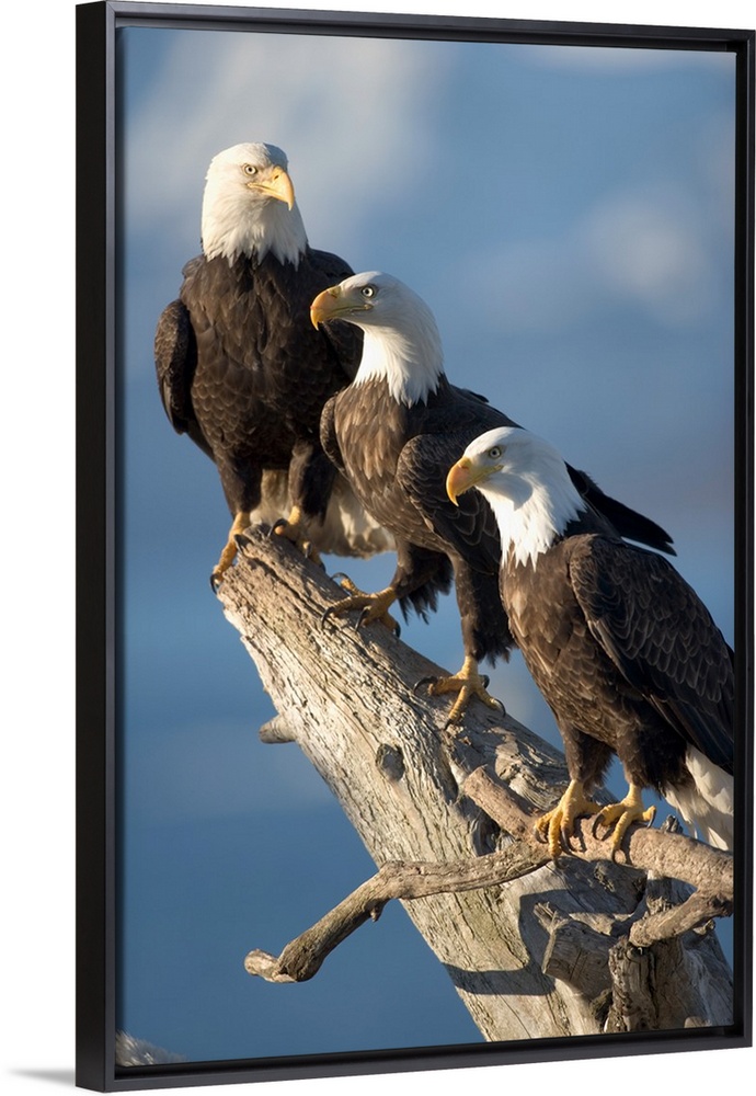 <p>Alaska, Homer, Bald Eagles (Haliaeetus leucocephalus) roost on driftwood perch along Kachemak Bay on a winter morning.</p>