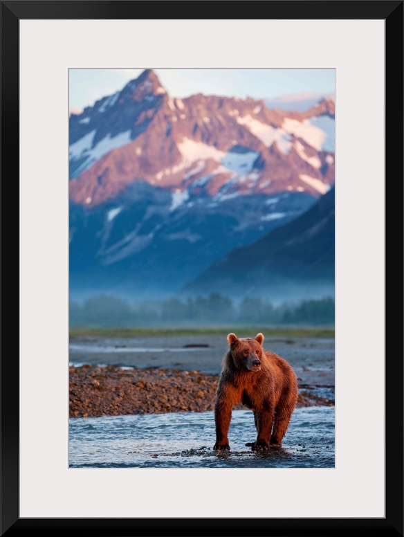 <p>USA, Alaska, Katmai National Park, Grizzly Bear (Ursus arctos) standing in salmon spawning stream beneath coastal mountains along Kukak Bay at dawn.</p>