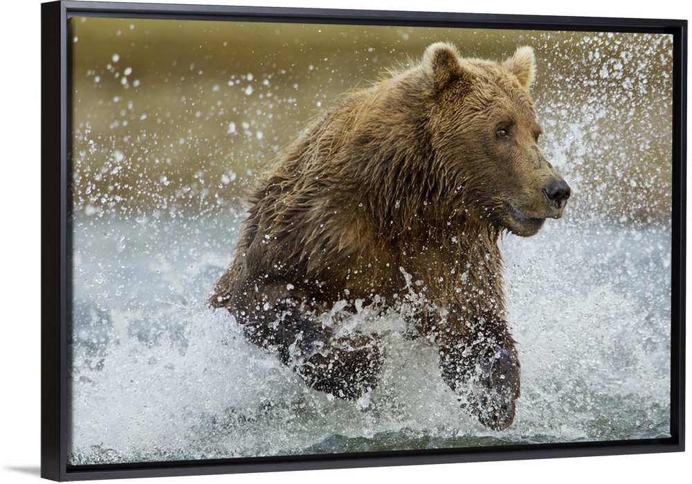 <p>USA, Alaska, Katmai National Park, Grizzly Bear (Ursus arctos) runs while fishing for spawning salmon along Kukak Bay on late summer day.</p>